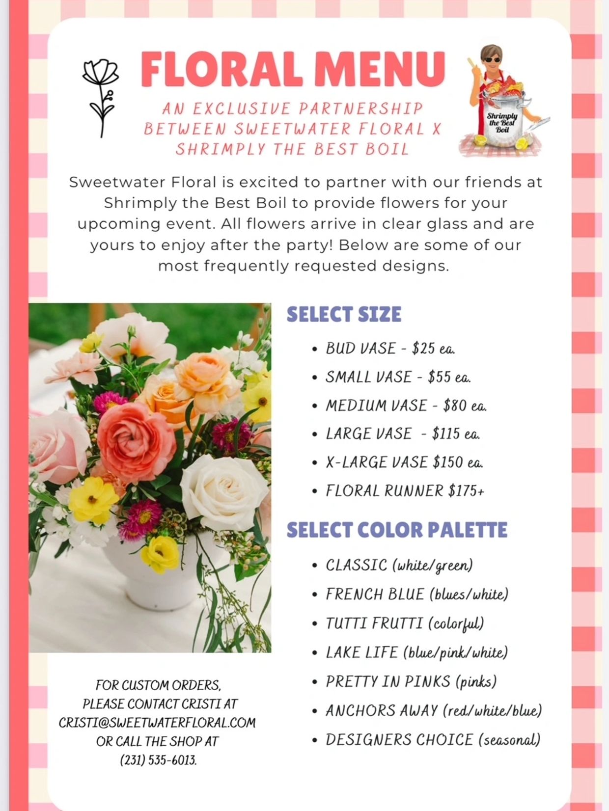 Add a floral centerpiece from Sweetwater Floral the day of your event starting at $25. Custom orders are available, call 231-535-6013 or email Cristi at cristi@sweetwaterfloral.com